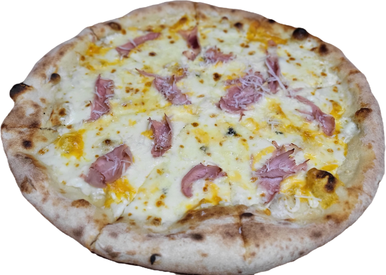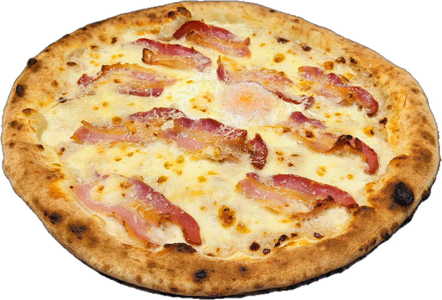 Pizza Carbonara – o reinterpretare a clasicei paste, cu sos alb cremos, bacon afumat, mozzarella,