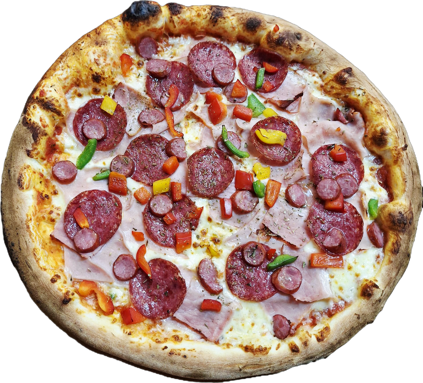 Un mix generos de carne: bacon afumat sunca , cârnăciori și piept de pui marinat, pe blat cu sos Mutti și mozzarella , completat de ceapă roșie pentru un gust rustic și echilibrat.